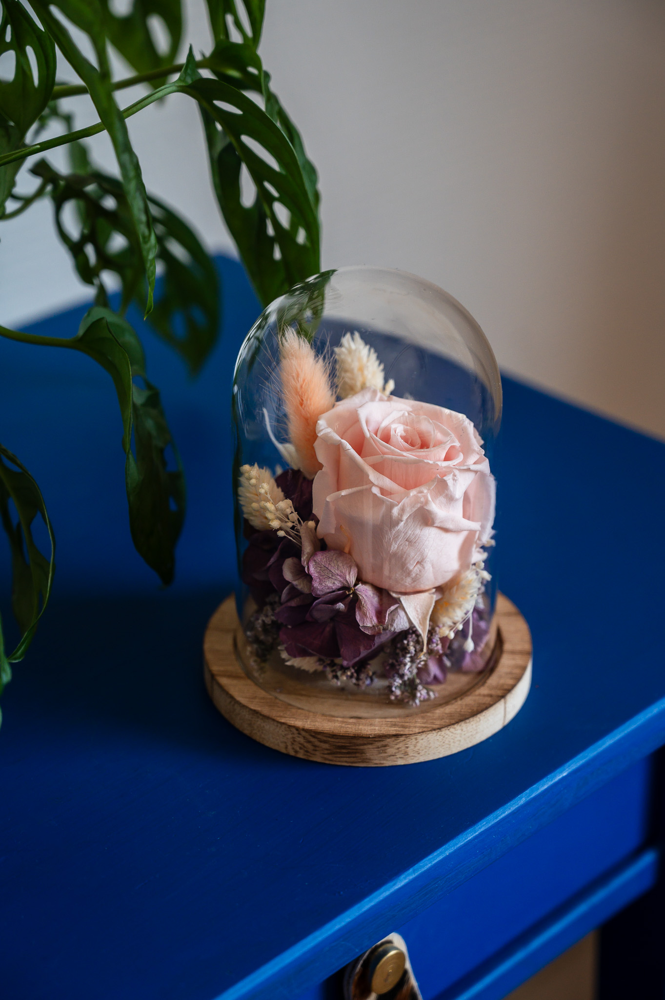 Une rose délicatement poudrée, entourée de fleurs séchées aux nuances douces. Alma, une cloche florale douce et facile à intégrer dans votre intérieur.