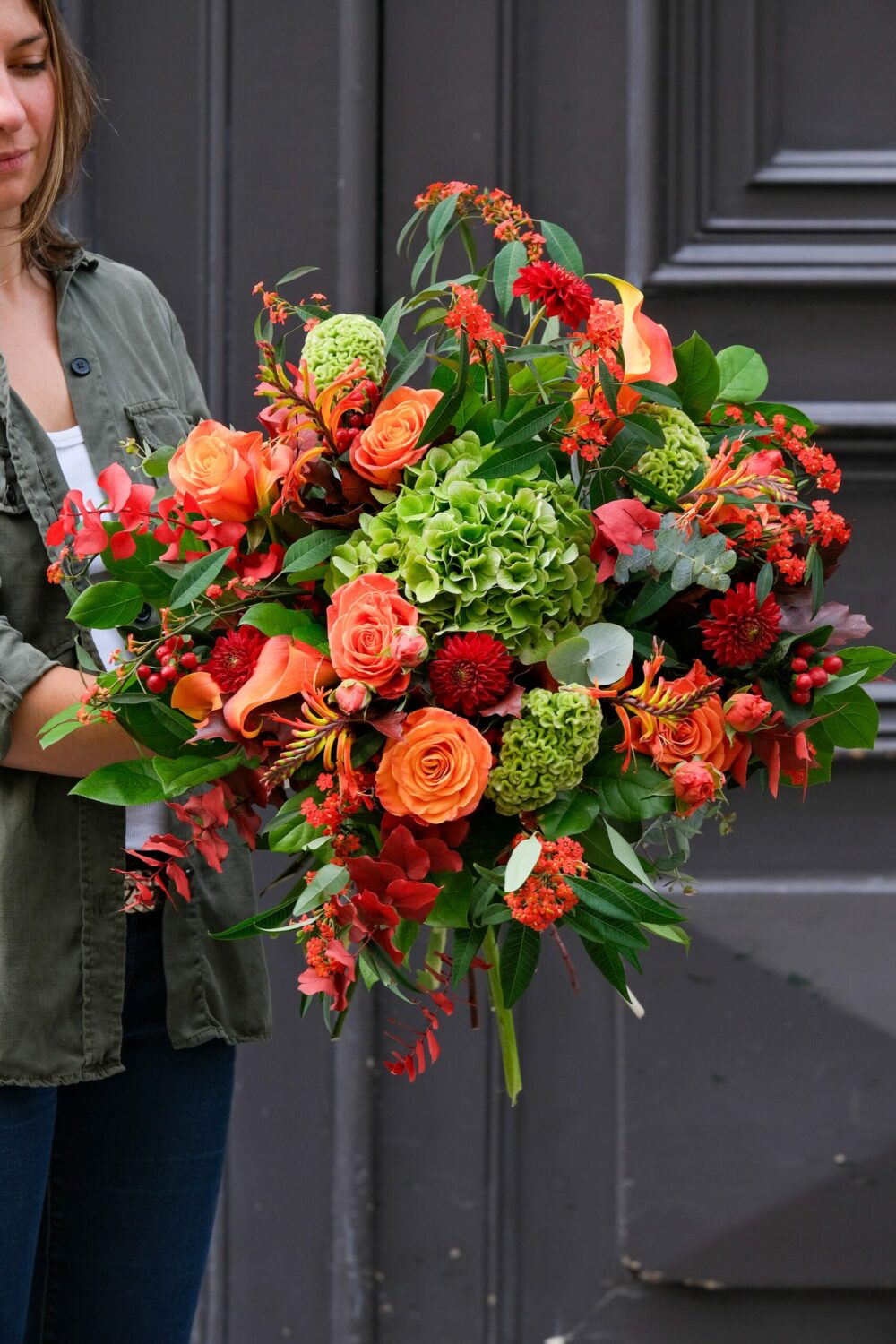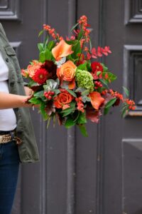 Ce bouquet aux tons orangés combine diversité de fleurs et de textures pour un rendu visuellement riche et harmonieux.
