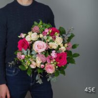 Le bouquet de fleurs roses « La Vie en Rose » est composé d'un camaïeu de fleurs de saison allant du rose pastel au rose fuchsia.