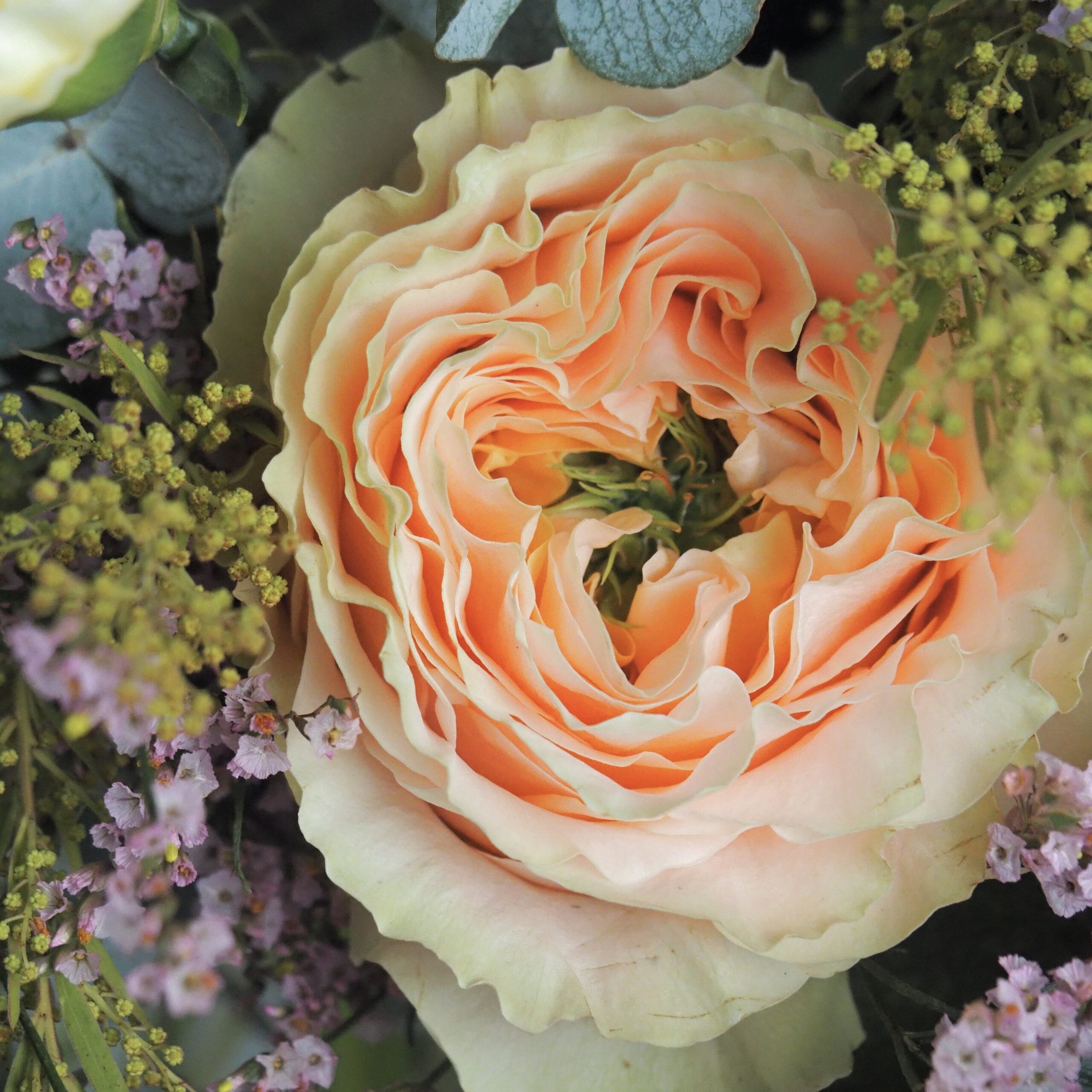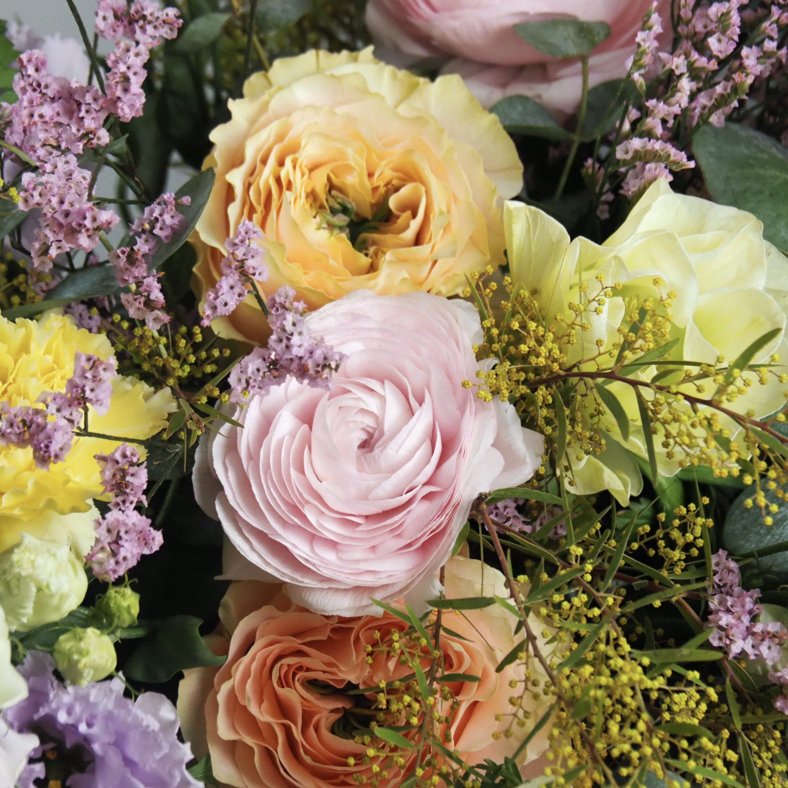 Les couleurs qui composent ce bouquet sont le rose poudré, le mauve, le jaune pale, le vert pale, le pêche, et l’ivoire/nude.