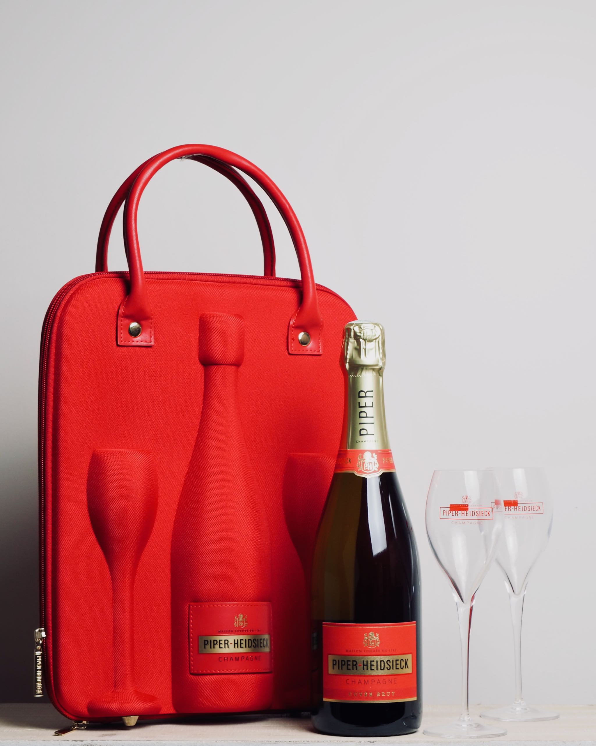 Une idée cadeau originale ! Le coffret rouge à l’intérieur doré contient une bouteille de champagne brut Piper Heidsieck et deux flutes marquées des couleurs de la maison Piper Heidsieck.
