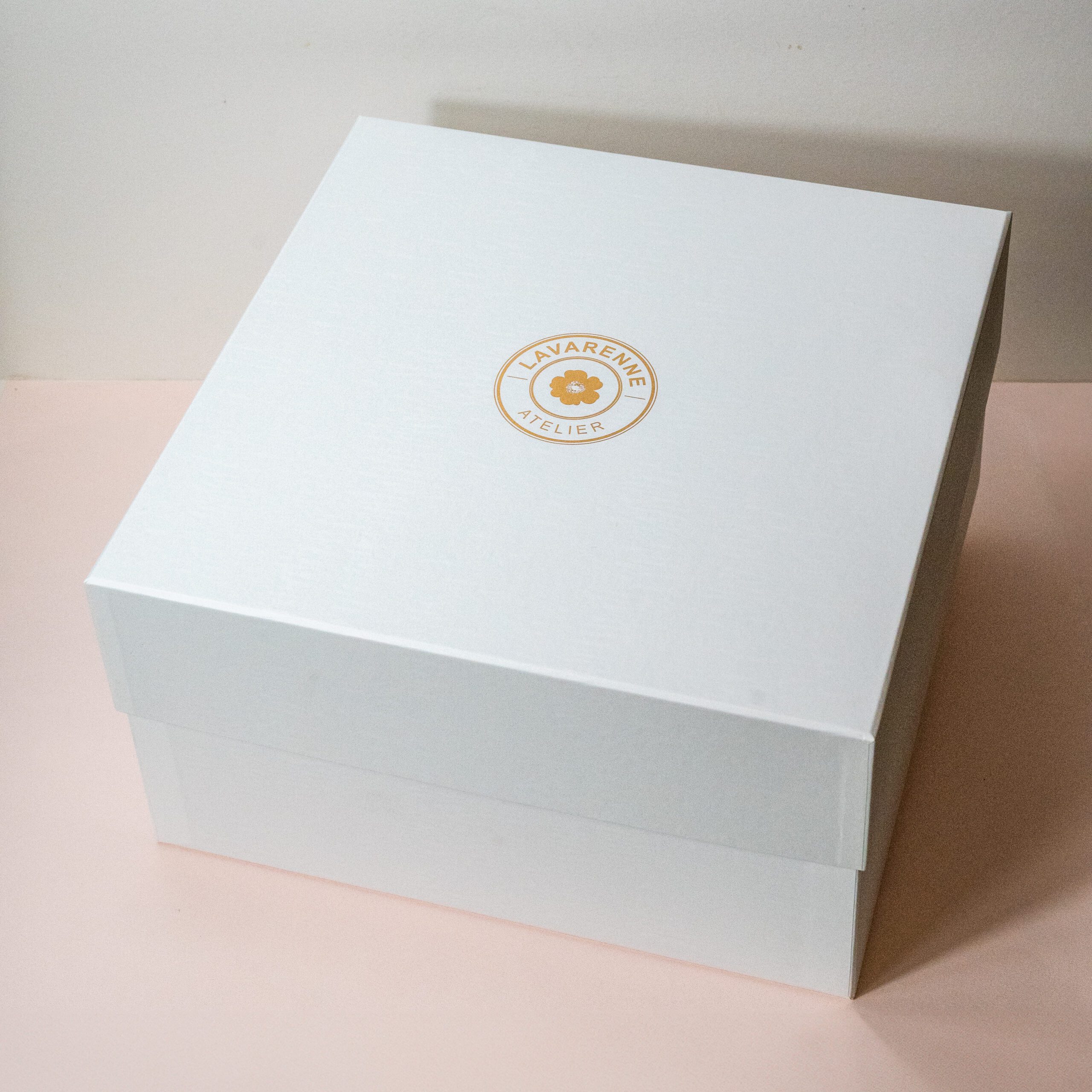Les coffrets-fleuris de l’Atelier Lavarenne sont des modèles déposés, permettant de créer une composition florale en volume au-dessus de la base. Leur couvercle en forme de cloche protège les fleurs sans les écraser, préservant ainsi l’effet de surprise jusqu’à la dernière seconde.