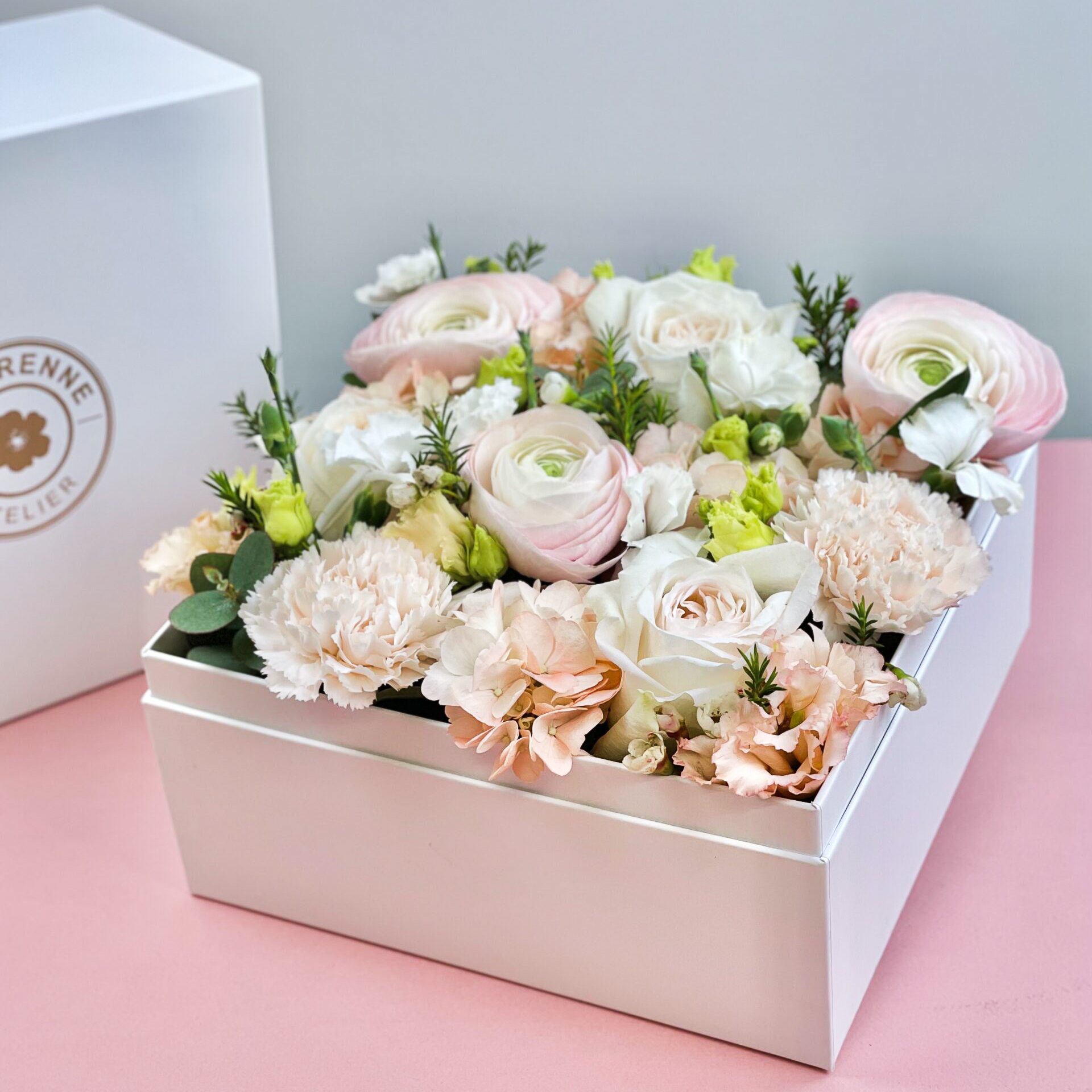 Le coffret-fleuri "Douceur Poudrée" est composé de fleurs dans un camaïeu très délicat de tons ivoire, rose poudré et blanc. . C’est une flower box douce et raffinée.