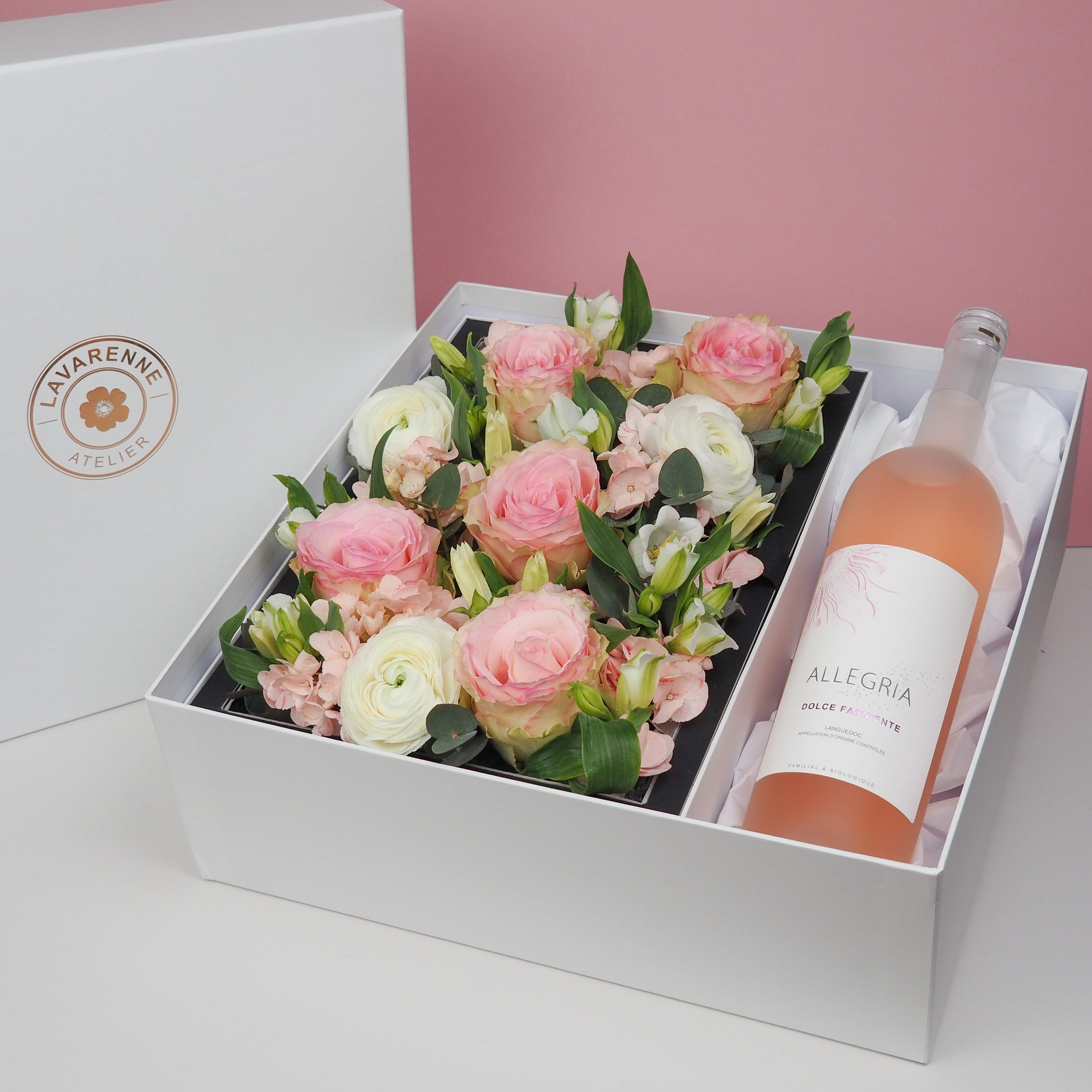 Le coffret-fleuri « Douceur Poudrée », une alliance parfaite de fleurs élégantes et d’un vin ou champagne.
