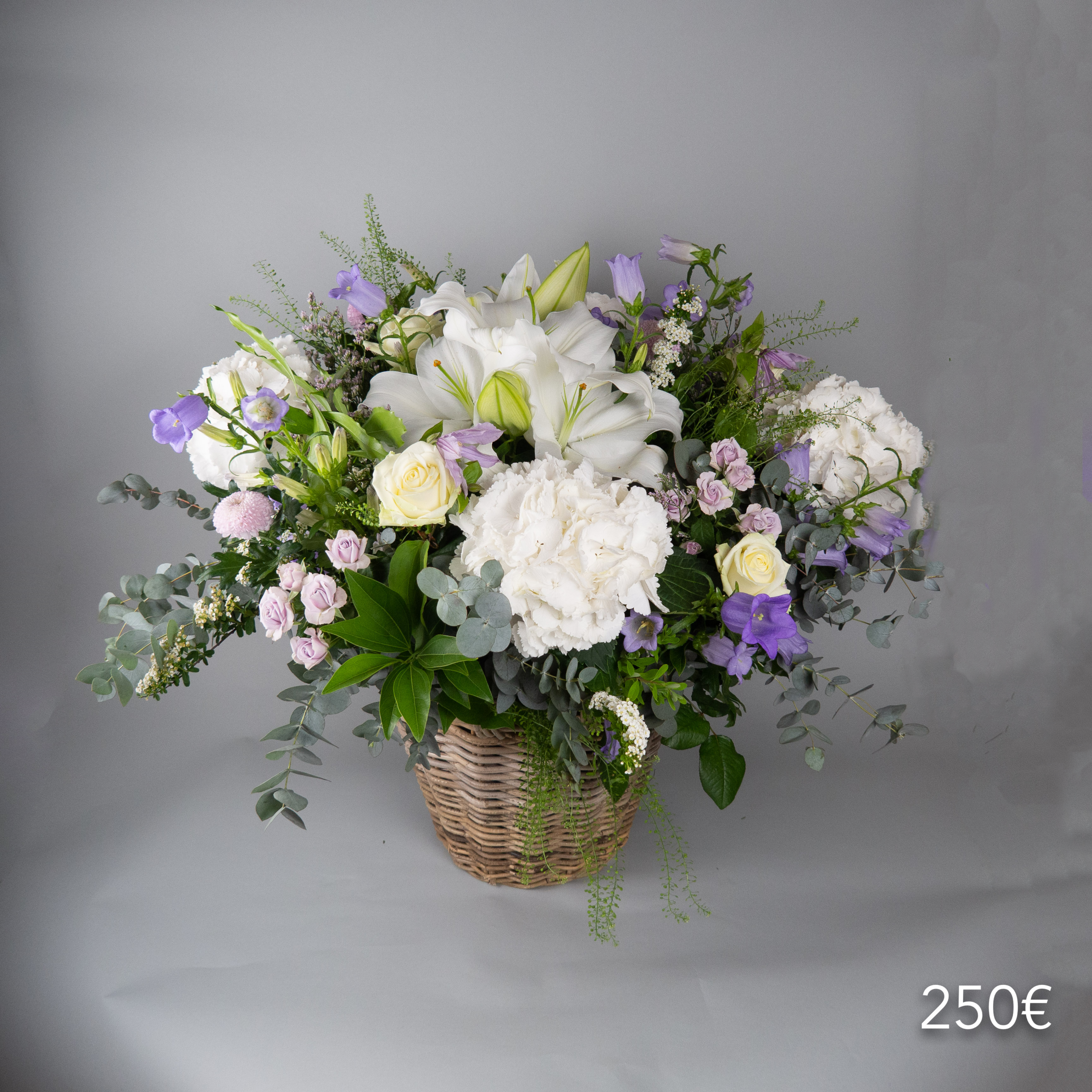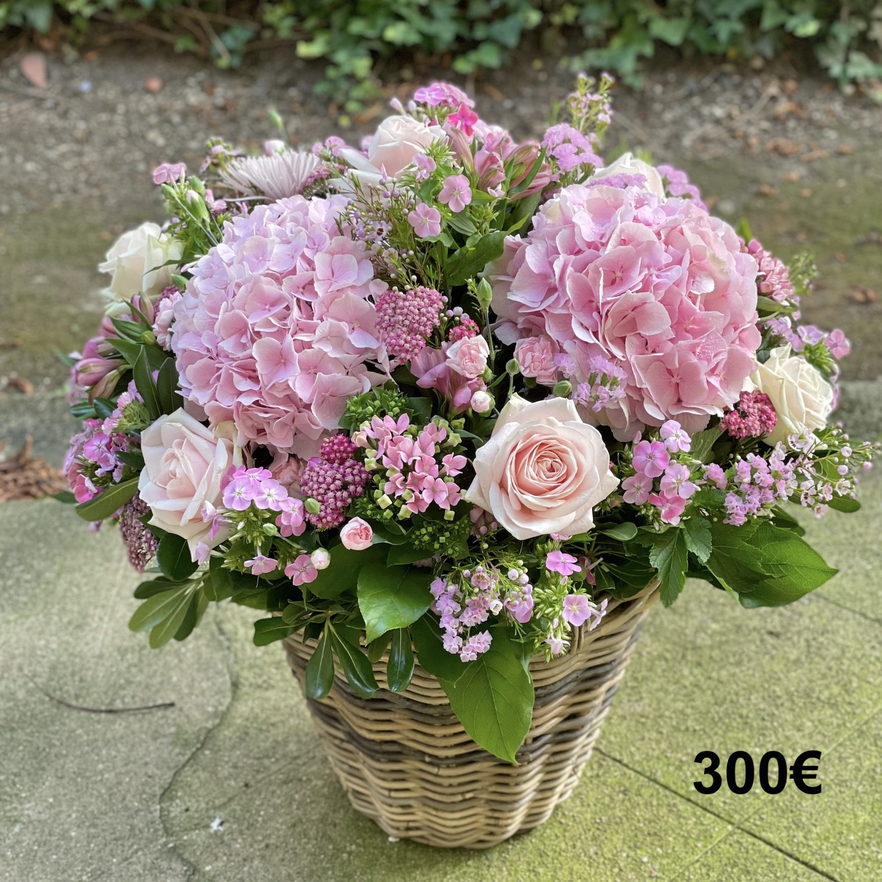 Nous proposons la corbeille fleurie « Buisson » travaillée dans un style naturel inspiré du charme des jardins anglais. Cette composition à une forme ronde, mais pas trop stricte à l’image des rosier buisson ou des hortensias de nos jardins, a l’avantage d’être remarquable sans être ostentatoire. Elle est souvent demandée lors de la cérémonie afin de décorer le pied du pupitre ou être disposé en paire de part et d’autre du cercueil. La composition est présentée dans joli panier en osier ou rotin tressé, de couleur beige, grisé ou gris perle et blanc (la couleur du panier varie, votre fleuriste choisira celle qui mettra le mieux la couleur des fleurs).
